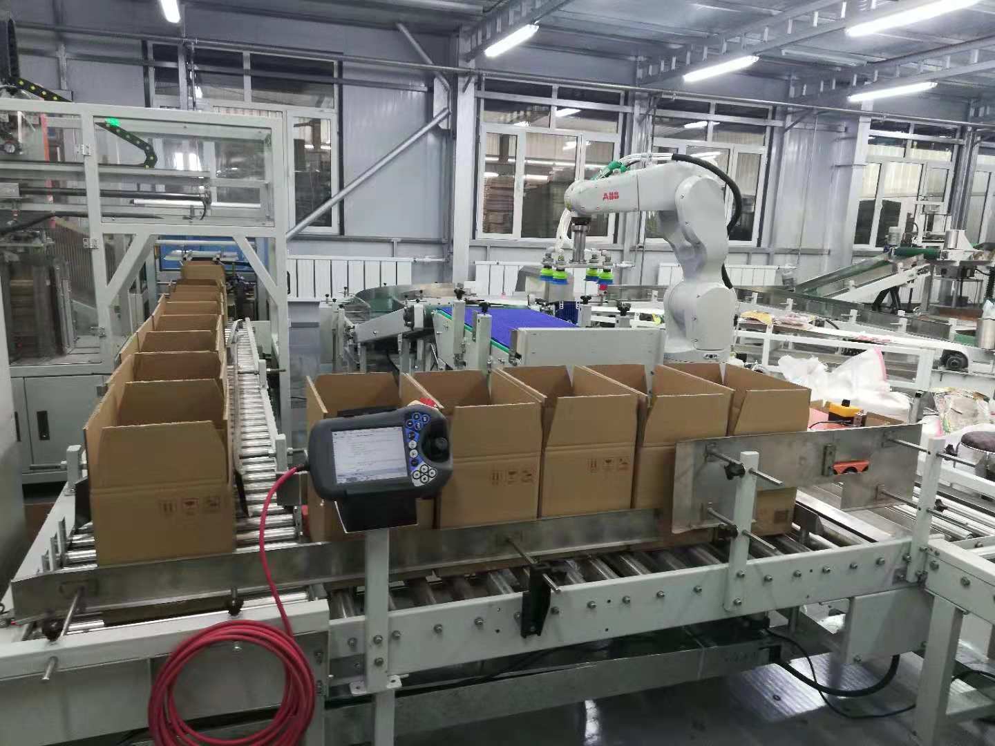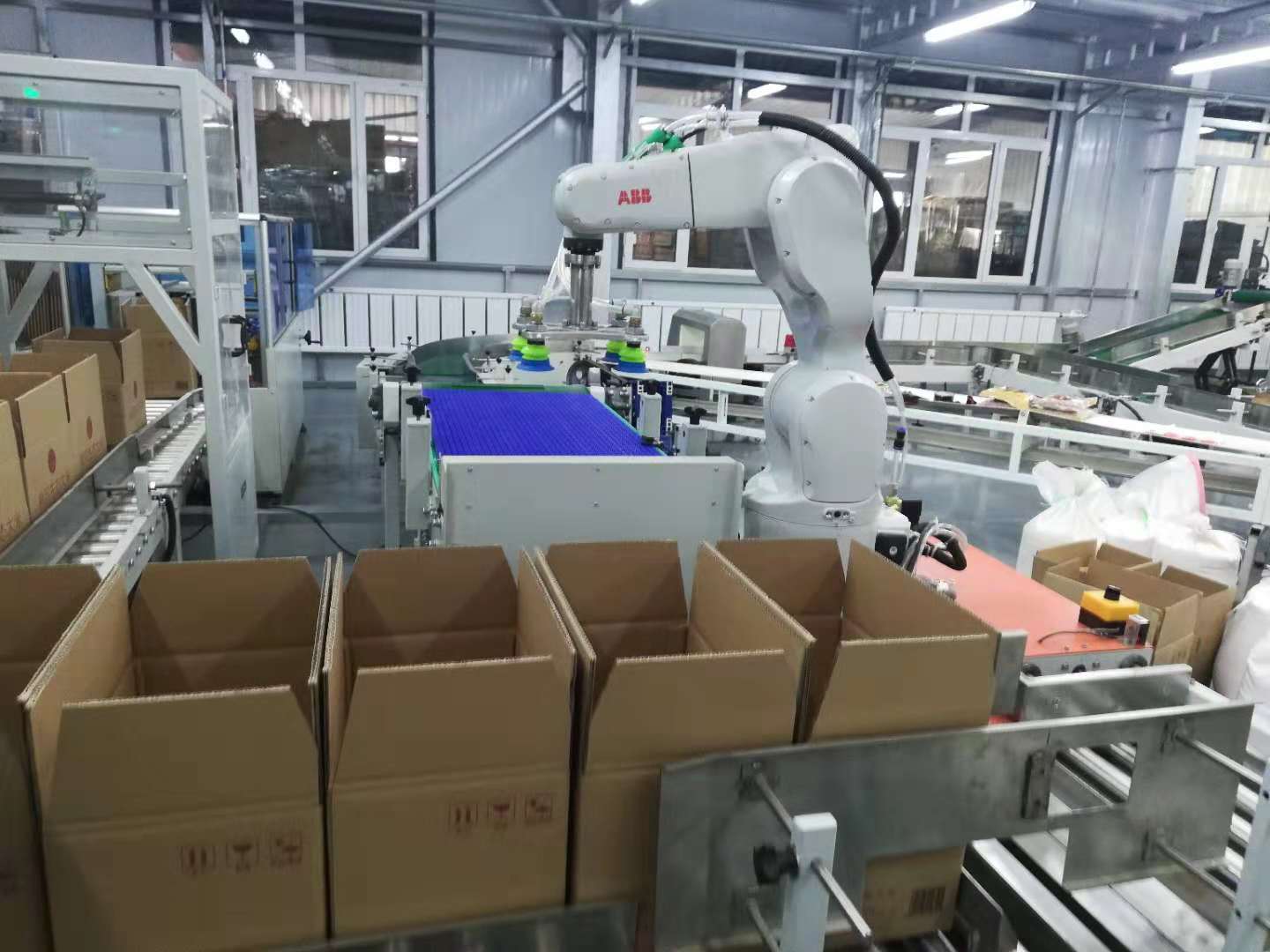 將產(chǎn)品通過(guò)進(jìn)料輸送帶輸送進(jìn)料,機(jī)器人及夾具到產(chǎn)品上方,抓取產(chǎn)品后移動(dòng)到裝箱位,按事先輸入的裝箱形式進(jìn)行產(chǎn)品裝箱。