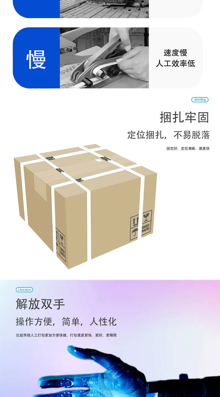 介紹:產品簡介: 束帶機能夠使「紙帶」或「透明膠帶」捆包,選用熱熔式粘接,產品捆包簡潔、美觀。也能夠跟據生產需要配合輸送帶,實現無人化捆包。 應用行業: 該款打包機廣泛應用于醫藥、食品、日化以及其他輕工業等行業。