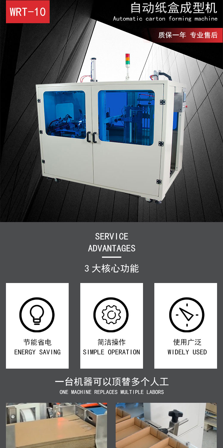 介紹:自動紙盒成型機采用氣動控制,通過模具自動折蓋成型,紙瓣自動鎖住紙板,使紙板成型不需要膠帶或熱熔膠粘合。操作簡單,穩定。該款紙盒成型機廣泛應用于電器、玩具、食品、服裝、汽車用品等行業。 產品別稱:全自動開箱機、高速開箱機、立式開箱機、臥式開箱機、電商開箱機、快遞開箱機、伺服開箱機、紙箱開箱機